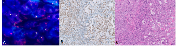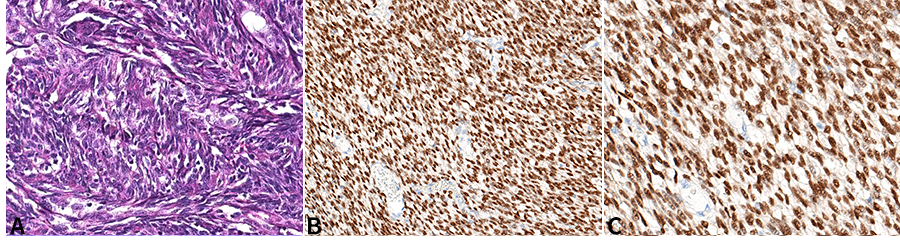 圖2.雙相型滑膜肉瘤(A.HE染色,中倍放大)。免疫組化染色SS18-SSX(E9X9V)腫瘤細(xì)胞核彌漫強(qiáng)陽性(B.低倍放大,C.高倍放大)