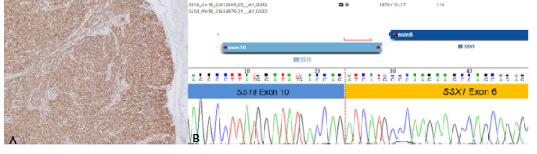 圖3.免疫組化染色SS18-SSX(E9X9V)強(qiáng)陽性,NGS測序證實(shí)具有滑膜肉瘤特征型的SS18-SSX融合基因(引自參考文獻(xiàn)5)
