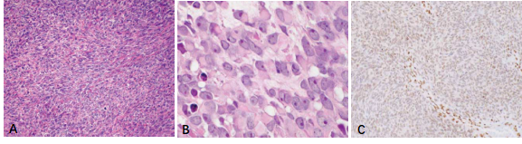 圖2.雙相型滑膜肉瘤(A.HE染色,中倍放大)。免疫組化染色SS18-SSX(E9X9V)腫瘤細(xì)胞核彌漫強(qiáng)陽性(B.低倍放大,C.高倍放大)